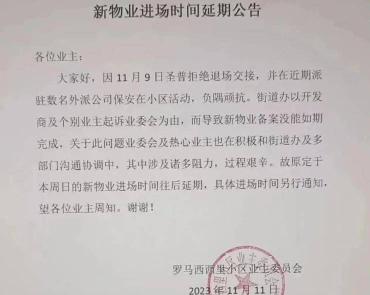 然而,在罗马西西里业主以为一切都在顺利推进的时候,原物业却不愿交接,导致新物业进场时间只能延期。