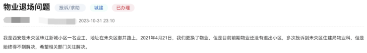 10月31日,珠江新城一业主留言,表示自己所在小区原物业在2021年4月21日就更换了,但2年多了,前期物业还没有退出小区,希望能够得到解决。