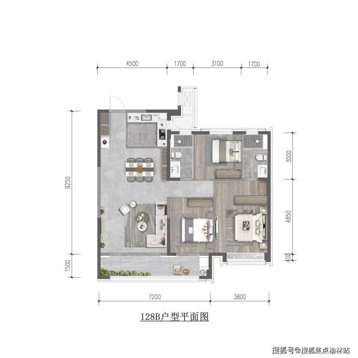 A户型| 建筑面积约128㎡ 三室两厅两卫