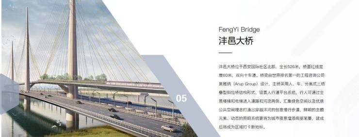 沣邑大桥位于西安国际社区北部,全长526米,桥面红线宽度60米,双向十车道。桥梁由世界排名第一的工程咨询公司奥雅纳(Arup Group)设计,主桥采用人、车、分离式三塔叠型斜拉桥结构形式,设置人行道平台系统,行人可通过全景楼梯和电梯进入道路和河流两侧。汇集绿色空间以及优质公共空间理念打造出穿越沣河的创意慢行步道,鲜明的主题元素、动态的照明系统更将为城市夜景增添绚丽笔墨,建成后将成为区域打卡新地标。