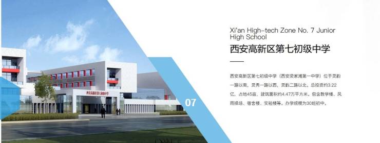 西安高新区第七初级中学(西安梁家滩第一中学)位于灵韵一路以南,灵秀一路以西,灵韵二路以北。总投资约3.22亿,占地45亩,建筑面积约4.47万平方米。包含教学楼、风雨操场、宿舍楼、实验楼等。办学规模为30班初中。