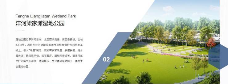 湿地公园位于沣河东岸,北至西汉高速,南至秦镇桥,全长4.5公里。项目在沣河流域梁家滩节点综合保护与利用的基础上,引入“绿道”概念,规划有农家果庄、农庄民宿、组合服务店、民俗展示馆、岩石餐厅、湿地科普馆等。沿沣河东岸打造集生态游赏、休闲娱乐、文化体验等功能于一体的生态湿地公园。