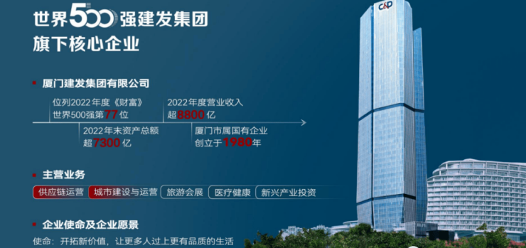 建发集团是福建省龙头企业,主要业务涵盖供应链运营、城市建设与运营、旅游会展、医疗健康、新兴产业投资等领域。2022年营业收入超8800亿,年末资产规模总额超7300亿,位列《财富》世界500强第77位。