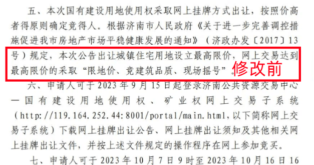 济南:10月9日,济南市自然资源和规划局发布补充公告,对此前9月份就已发布过出让公告、即将于10月中下旬进行的两场土拍出让规则进行调整,从此前的达到最高限价的采取“限地价、竞建筑品质、现场摇号”修改为按照价高者得原则确定竞得人。