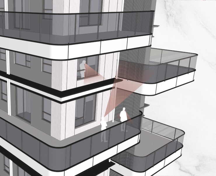 上层明窗隔断,将下层活动区域完全遮挡。同时,下层业主受到边缘视角的限制,在其可及范围内也无法直接看到上层卧室。既保证了私密性,又达到了美观的效果。