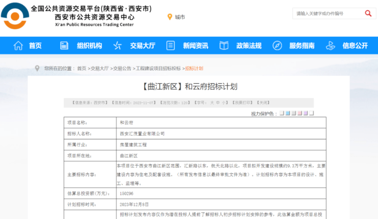 在拿地5天后,项目就发布了招标计划,流出的案名为和云府。根据项目发布的招标计划,项目拟开发建设规模约9.3万平方米,主要建设内容为住宅及配套设施(所有发布信息以最终审批文件为准)。