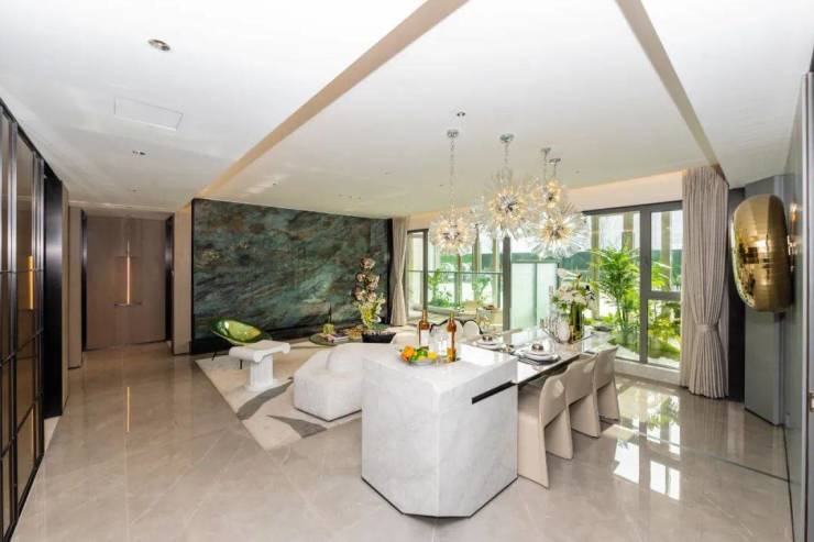 突破式运用奇偶错层设计打造约6m挑高的空中庭院,这种设计常见于一线城市豪宅项目,最大化的引景入室,抬头是璀璨星河,俯瞰为繁花谧境。