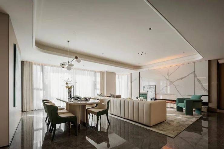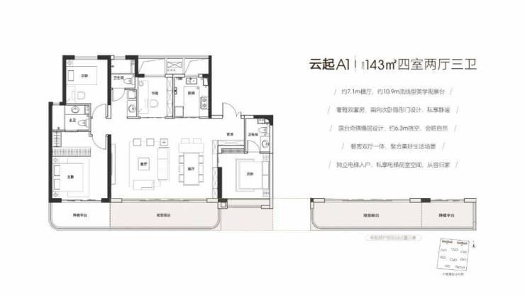 143㎡的四房,将尺度感和居住的舒适度进行了升级,功能性也更强。南向双套房设计,全生命周期空间,让家庭的居住感更加均衡。在功能性完成的很好的基础上,叠加上7.1米宽的横厅、10.9米的流线型美学观景台,LDK一体化设计、洄游式动线让整个居家空间灵动宽阔。
