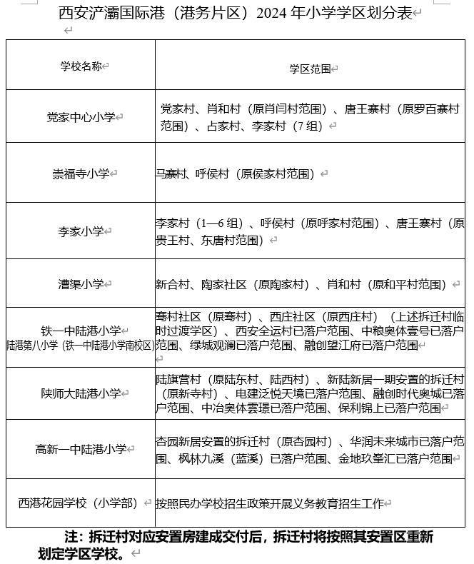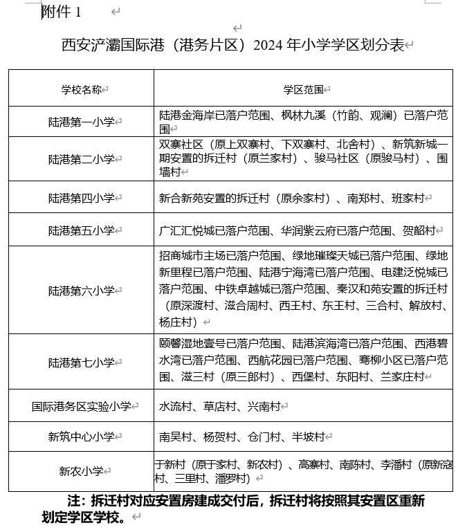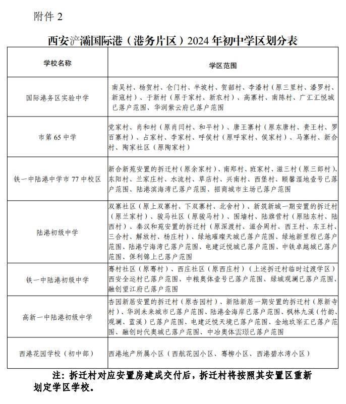 二、浐灞国际港(港务片区)2024年义务教育学区划分统筹考虑辖区内适龄儿童少年入学人数、历史沿袭、学校布局、学校所处区域、学校学位承载能力、辖区社会经济发展及人口变化等因素,按照相对稳定、相对就近、适度调整的原则为义务教育学校科学划定学区范围,确保义务教育免试入学全覆盖。