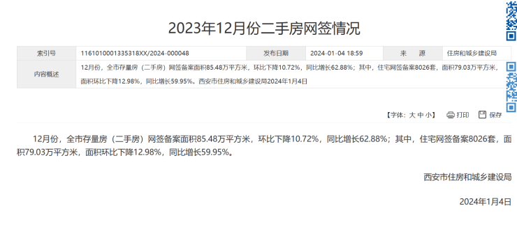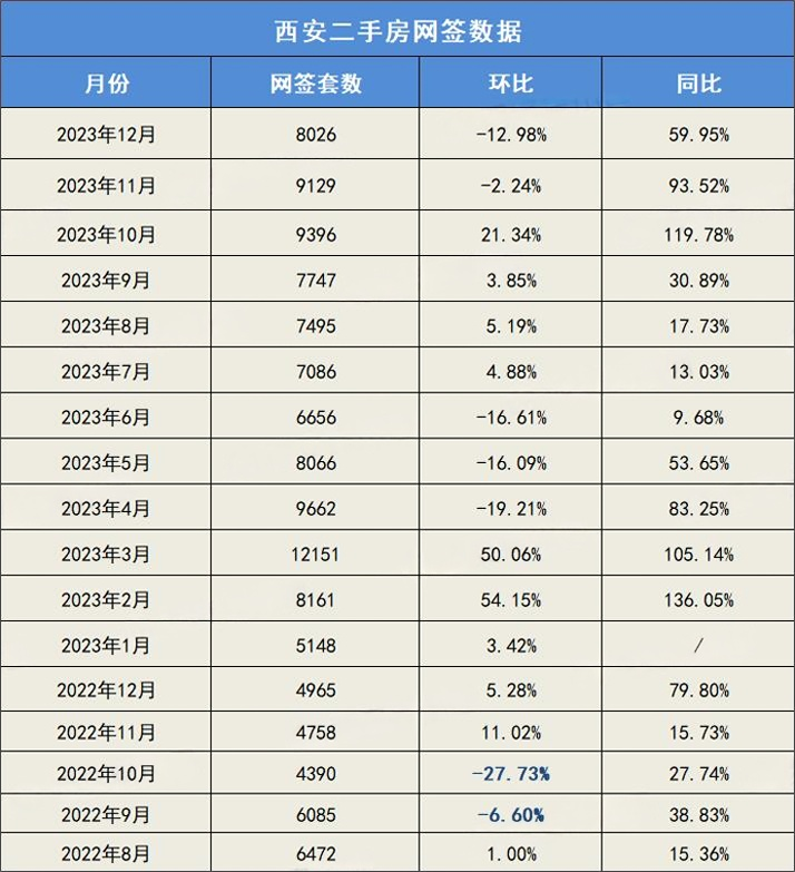 西安2023年12月二手房网签数据出炉!12月环比下降12.98%!