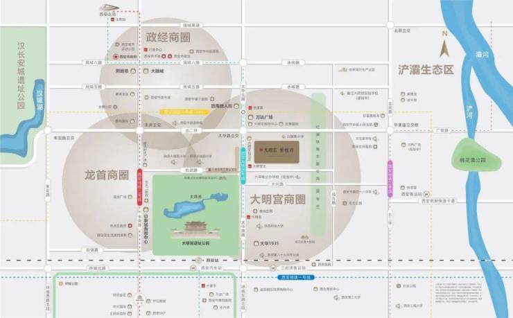 大明宫紫檀府,位于曲江大明宫遗址保护区玄武路与马旗寨路交汇处东北角。距离地铁4号线大明宫北站 —— 步行500米。项目距离地铁4号线大明宫北站仅为0.5公里,该线路南至航天新城,北至北客站,依次行经大雁塔、大差市、大明宫、行政中心等重要站点,串联起了西安的航天科技中心、文化旅游中心、城市行政中心和交通枢纽中心,是贯穿西安南北的地铁大动脉。