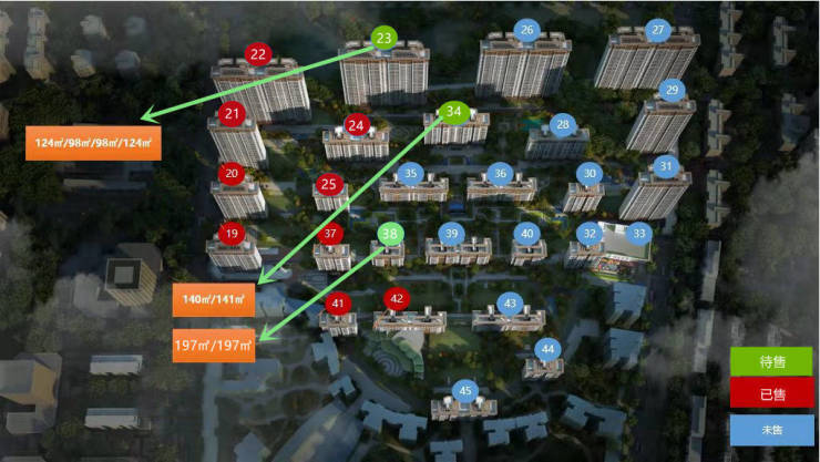 高层:98㎡、124㎡;小高层:141㎡;洋房:197㎡。