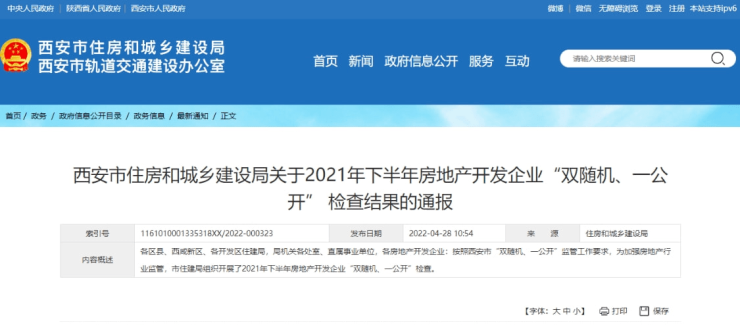 4月28日,西安市住房和城乡建设局官网发布《西安市住房和城乡建设局关于2021年下半年房地产开发企业“双随机、一公开”检查结果的通报》(以下简称《通报》)。