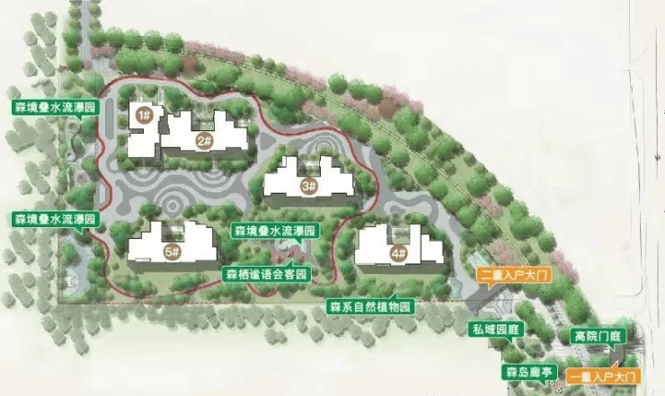 以多重树阵为入户主景,层层珍植与艺术装饰相映成趣,仿若一片茂然森域的微光入口,两侧银杏、国槐等列阵树阵,造极归家仪式感。迈入门庭门廊,开启一段森境自然游览之旅。