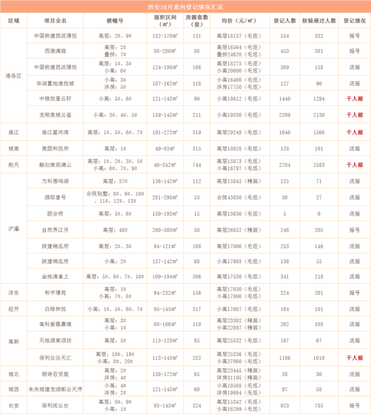 据统计,10月西安城六区、长安区、沣东新城共计24个项目(为同一楼盘多批次登记进行重复计算)4532套房源进行意向登记,登记家庭共13781组。核验后,共10个项目10487组家庭参与摇号。
