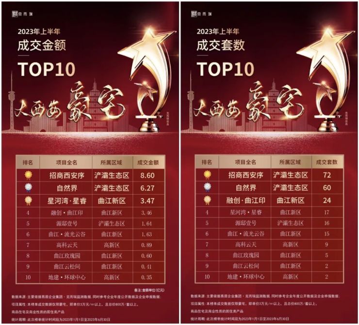 根据克而瑞数据机构统计的《2023年上半年西安豪宅成交套数、金额榜单》,招商西安序以半年72套、8.6亿的成绩问鼎双料TOP1。