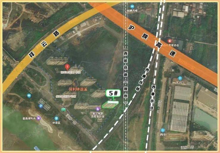 保利林语溪位于灞桥区祥云路与灞柳一路交叉口东北角,小区5号楼距离铁路最近,直线距离不到20米,高差近30多米。