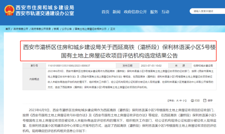 西安市住建局发布了”"灞桥区住房和城乡建设局关于西延高铁(灞桥段)保利林语溪小区5号楼国有土地上房屋征收项目评估机构选定结果公告"!