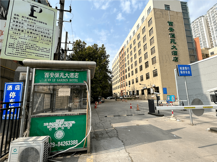 酒店旁停车场入口,保安亭空无一人,仅贴了一张酒店暂未营业的告示。但停车场正常开放,还有车正常出入,告示牌显示停车收费4元/小时。