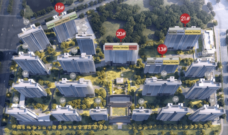 位于本次挂牌地块南侧的中建悦庐,推出13#、18#、20#、21#楼,共366套房源,建筑面积115-211㎡,均价28833元/㎡,也是项目的收官之作。
