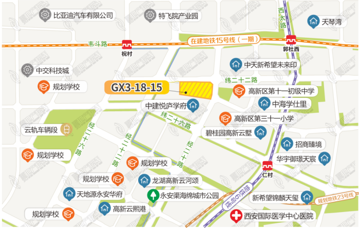 从目前的地段来看,这宗地优势十分明显。东侧紧邻两所名校,按照2023年高新区的学区划分,该地块位于学区范围内;近邻地铁6号线仁村站和15号线郭杜西站,出行较为方便;南侧600米左右为永安渠海绵城市生态公园,周边还有国际医学中心、永安渠商业街等配套。