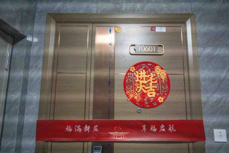 入户大堂以及电梯间欢迎回家的布置让人激动的心停不下来,然而巨大的惊喜还在后面。走到家门口,剪开入户门缝彩条,推门而入,首先映入眼帘的是,玄关柜上定制的贺卡、可乐、五谷杂粮礼盒;还有福满新居地垫、马桶贴、中国结等,处处洋溢着收房的仪式感。