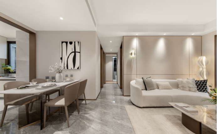 建面约129㎡的户型也相当给力,其将多在小高层中出现的四房两卫布局设计在了该项目高层上,且客厅的活动墙可根据业主需求进行自由改动,大横厅立现,奢阔品质感扑面而来。