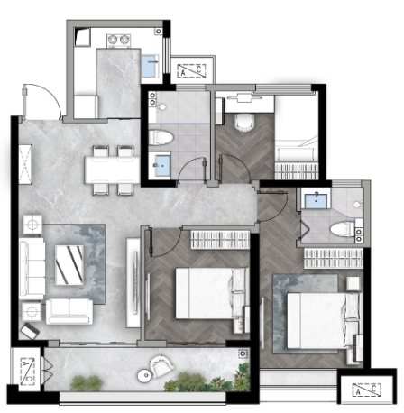 而项目的这个户型,区别于市面上常见的三室一卫设计,竟在99㎡的空间里打造出了三室两卫,且是全明三室,实用性非常强。