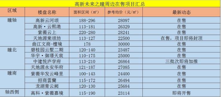 从整体上看,在售新盘主要集中在瞳轴核心板块以及瞳北区域。其次,就是瞳南和瞳轴两侧,整体的参考均价为2.6万/㎡。
