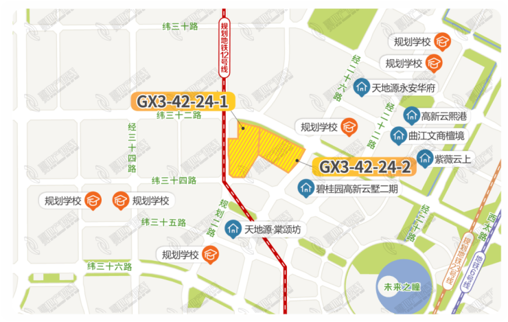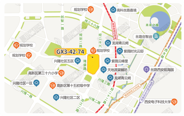 南侧,分布有高新区第三十六小学和高新区第十五初级中学,东侧临近规划地铁12号线,向东900米为在建地铁6号线南段和城市主干道西太路,交通便利。9月15日,西安市土地招拍挂市场挂牌出让2宗共133.809亩住宅用地,均位于高新区丝路科学城中央创新区。