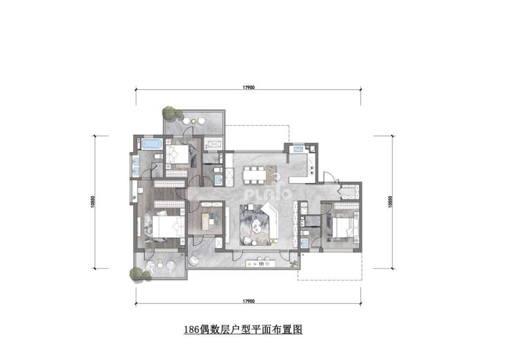186平四房两厅三卫,17.9米大面宽,双主卧!