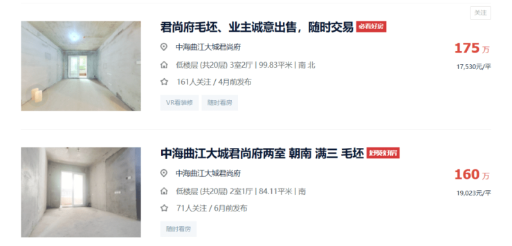 其中最低的一套,是99.83平的三房,挂牌价只有175万,折合单价17530元/平。要知道,当时该盘备案价是19295元/平,等于跌破了开盘价近2000元/平。更别说跟二手成交高点相比,基本上亏了200万。