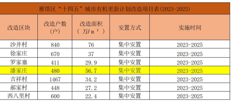 雁塔区“十四五”城市有机更新改造计划中,除了潘家庄,沙井村、徐家庄、罗家寨、吉祥村、郝家村、西八里村都还没有拆迁,按照这份计划的实施时间—2023-2025年,这些城中村大概率将在今年陆续实施。