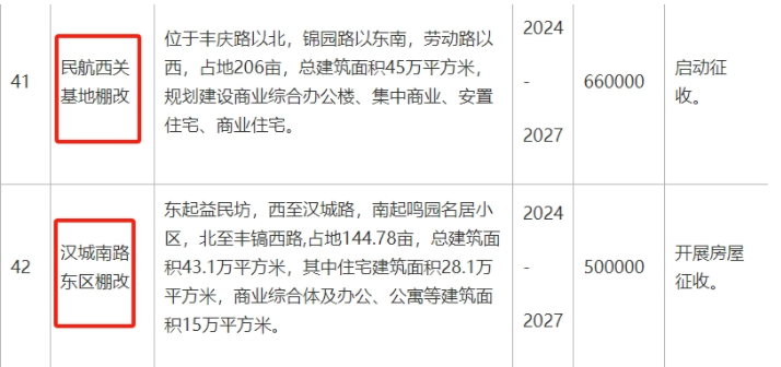 比如,民航西关基地棚改,位于丰庆路以北,锦园路以东南,劳动路以西,占地206亩,总建筑面积45万平方米,规划建设商业综合办公楼、集中商业、安置住宅、商业住宅,计划今年启动征收。