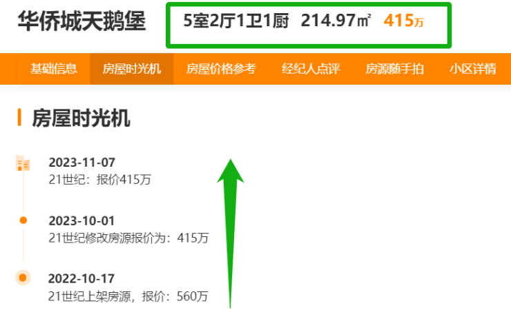 建面约215平的五室房源,挂牌一年之久,报价从560万跌至了415万,折合单价仅有19305元/平,实际成交价预计会更低;