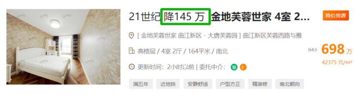 今天,金地芙蓉世家出了一套建面约164平的房源,降幅能直接拿下一套雁塔两室,折合降了8800元/平,实际成交价来算,降幅预计在1万/平左右。