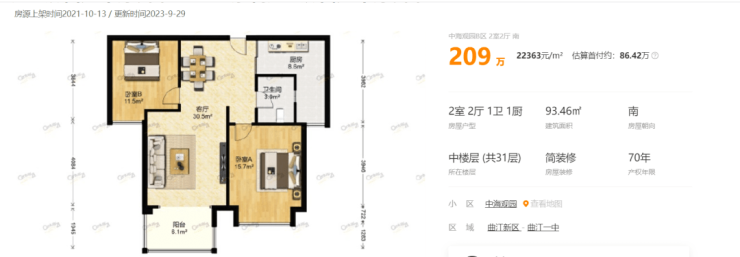 就以中海凯旋门为例,两室的住宅,半年前上架房源价格为191万,10月降了29万,至今还在挂牌,要知道21年两室房源,也不乏冲刺3万/平的势头。