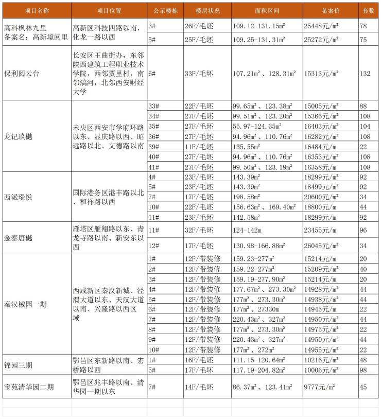 价格公示项目分别为:高科枫林九里、保利阅云台、龙记玖樾、西派璟悦、金泰唐樾、秦汉樾园一期、锦园三期、宝苑清华园二期。