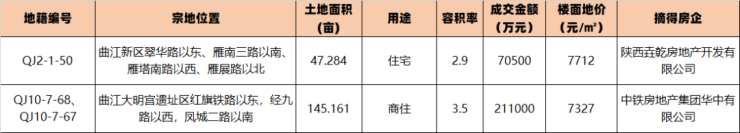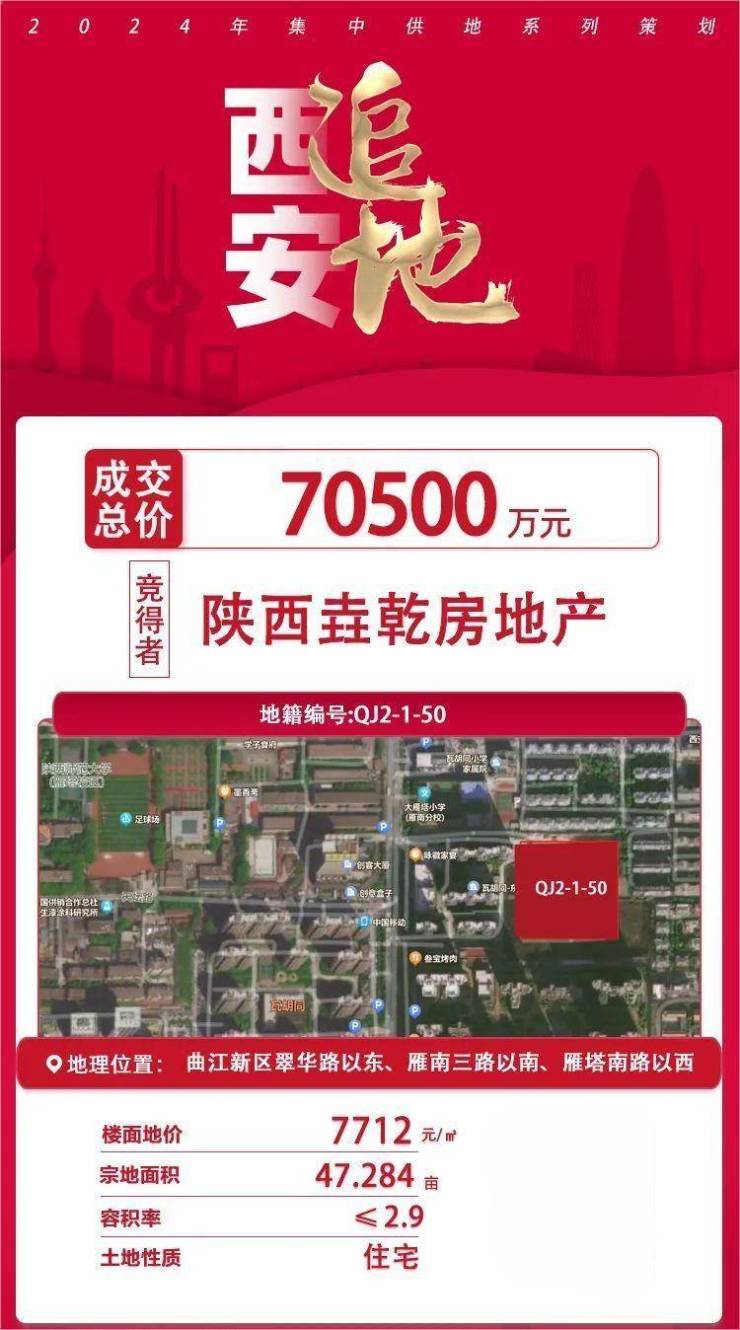 QJ2-1-50:净用地面积47.284亩,住宅用地,容积率≤2.9,成交土地总价70500万元,成交土地单价1491万元/亩,楼面价7712元/㎡,由陕西垚乾房地产开发有限公司摘得。