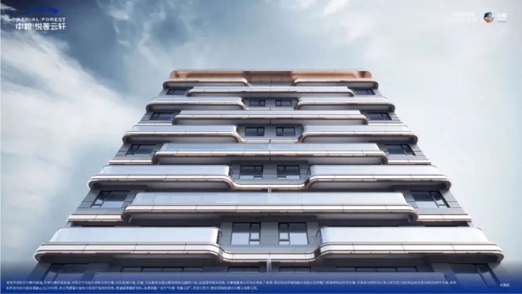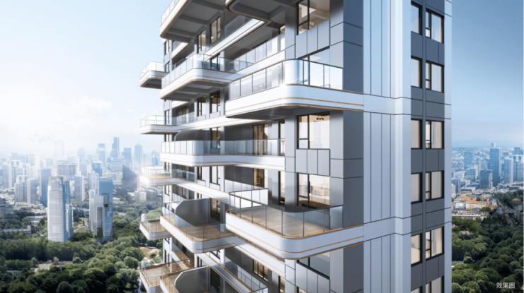 错层露台设计,外立面主要材质为当下顶豪流行的金属板+大面积玻璃,灵感来源于航空航天产业的工业设计美学,在具备硬挺对称的建筑美学的同时,极具品质感。
