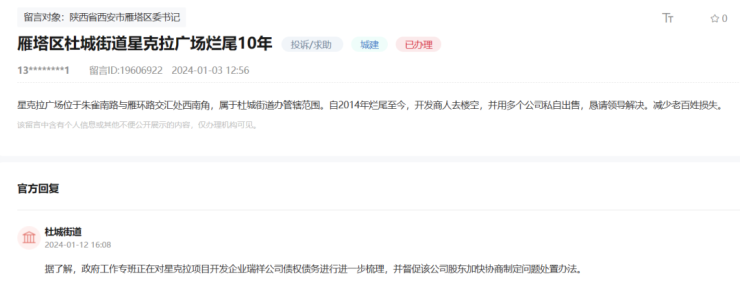 1月12日,官方最新回复是:工作专班正在对星克拉项目开发企业瑞祥公司债权债务进行进一步梳理,并督促该公司股东加快协商制定问题处置办法。相信在债务梳理后,项目将会迎来新进展!