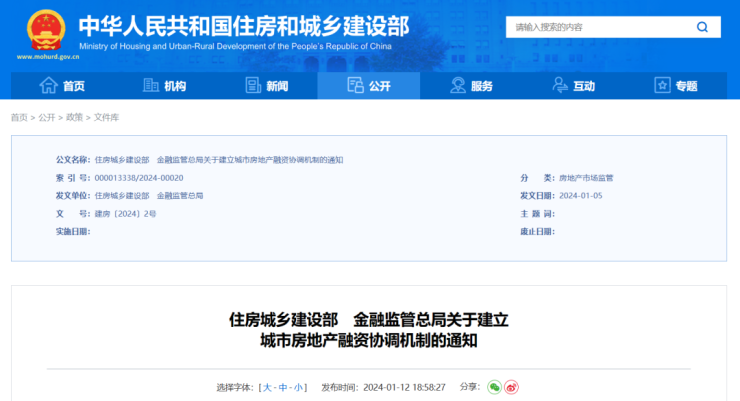 1月12日,住建部、金融监管总局联合发布《关于建立城市房地产融资协调机制的通知》。