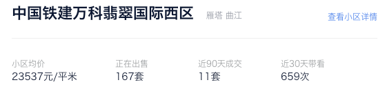 中国铁建万科翡翠国际作为曲江的神盘,在2018的开盘时均价10500元/㎡,最低单价不过万,如今二手房挂牌均价2.3-2.6万/㎡,房价直接翻了1倍多,没买的朋友肠子都怕悔青了。