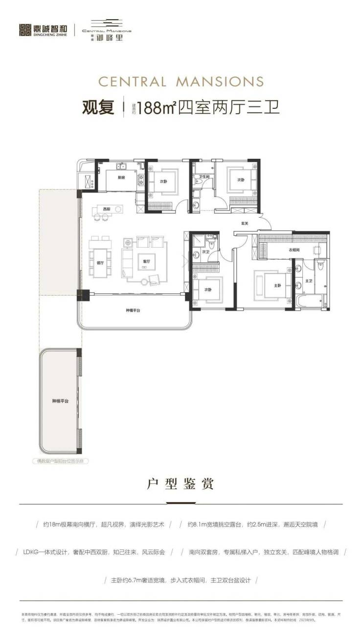 鼎诚御峰里建面约188㎡大平层〖观复〗,规划四室两厅三卫,几乎是“出道即巅峰”,在小高层领域之中,几乎没有可以媲美的户型: