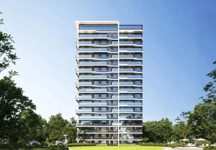 通过定制化的采购,大面积的玻璃幕墙,柔化处理圆弧转角,形成270°瞰景视野。此外,再加上金属线条的描边,横向线条的拉通,让建筑更加灵动。以及约6.3米的错层挑高露台,站在阳台上观景,如同在邮轮甲板上瞭望。