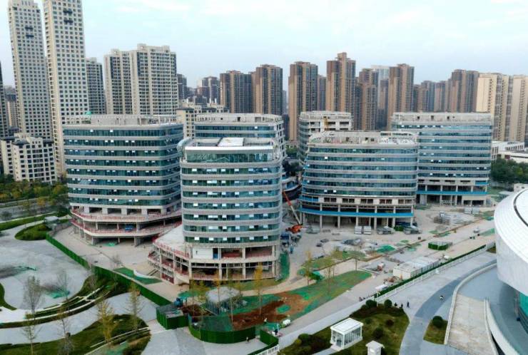 截至目前,配套区项目完成轻质隔墙板、二次结构砌筑施工,正在快速推进机电安装、幕墙安装、智能化及弱电安装、室外工程施工。