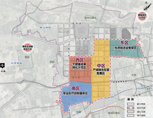 大健康产业,主要在塬北板块,秦汉新城在这里打造大健康产业园,另外这个板块还有已经建成投用的三甲医院陕西省人民医院(西咸院区)、即将开建的空军军医大学新校区及配套项目等,将会在这里形成大健康产业聚集。