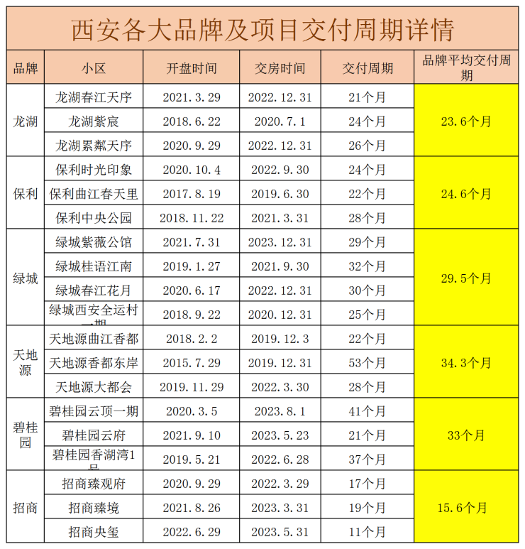 小编选择了这6个房企在西安开发的19个楼盘,看看这些项目各自的交付情况,并且算出了各个品牌的交付周期,如下表:
