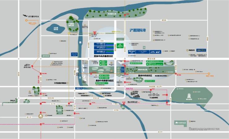 生态集群:灞河三角洲、奥体中央公园、浐灞国际湿地公园、全运湖、丝路国际体育文化交流培训基地、灞河东路生态廊道、陆港纪念公园
