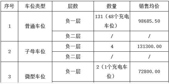 本次开盘全部可售车位137个,总面积3908.32㎡,本次开盘销售的全部可售产权车位均价99259.85元/个,各类型车位销售均价及数量明细如下:
